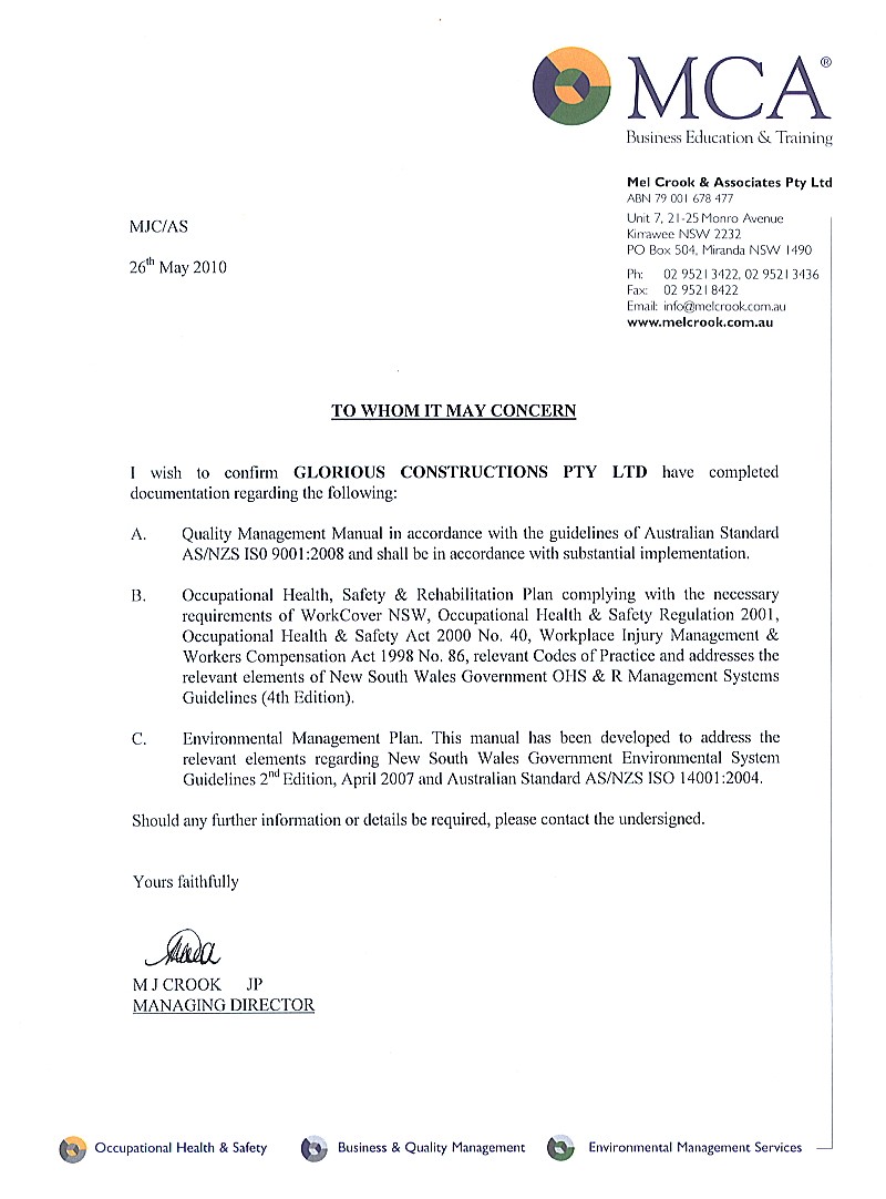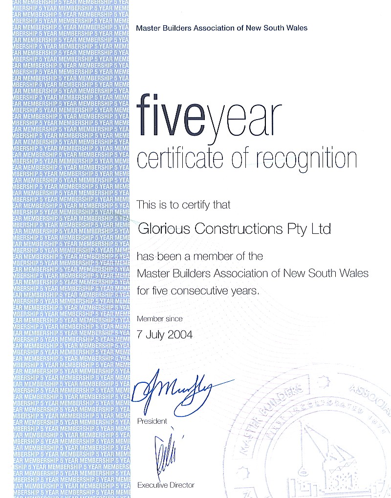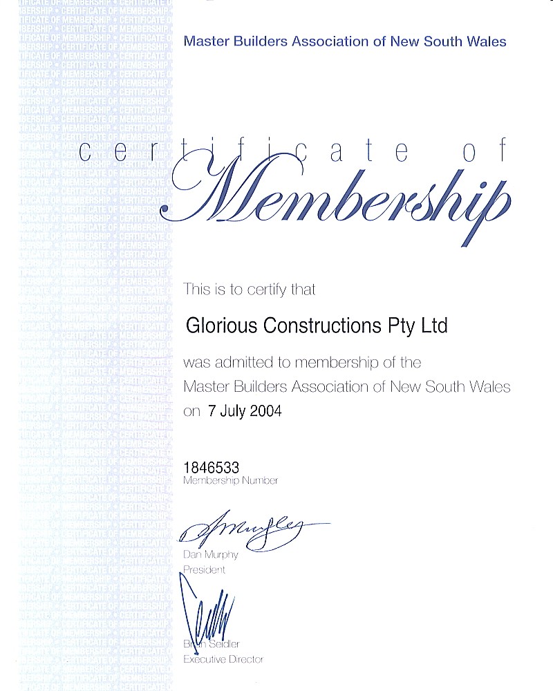 Glorious Constructions is proactive in ensuring that we attain and maintain industry standard certification and acknowledgement.